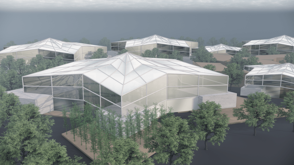 Proposal for cooperative living greenhouses where contributing earns shares in the land.