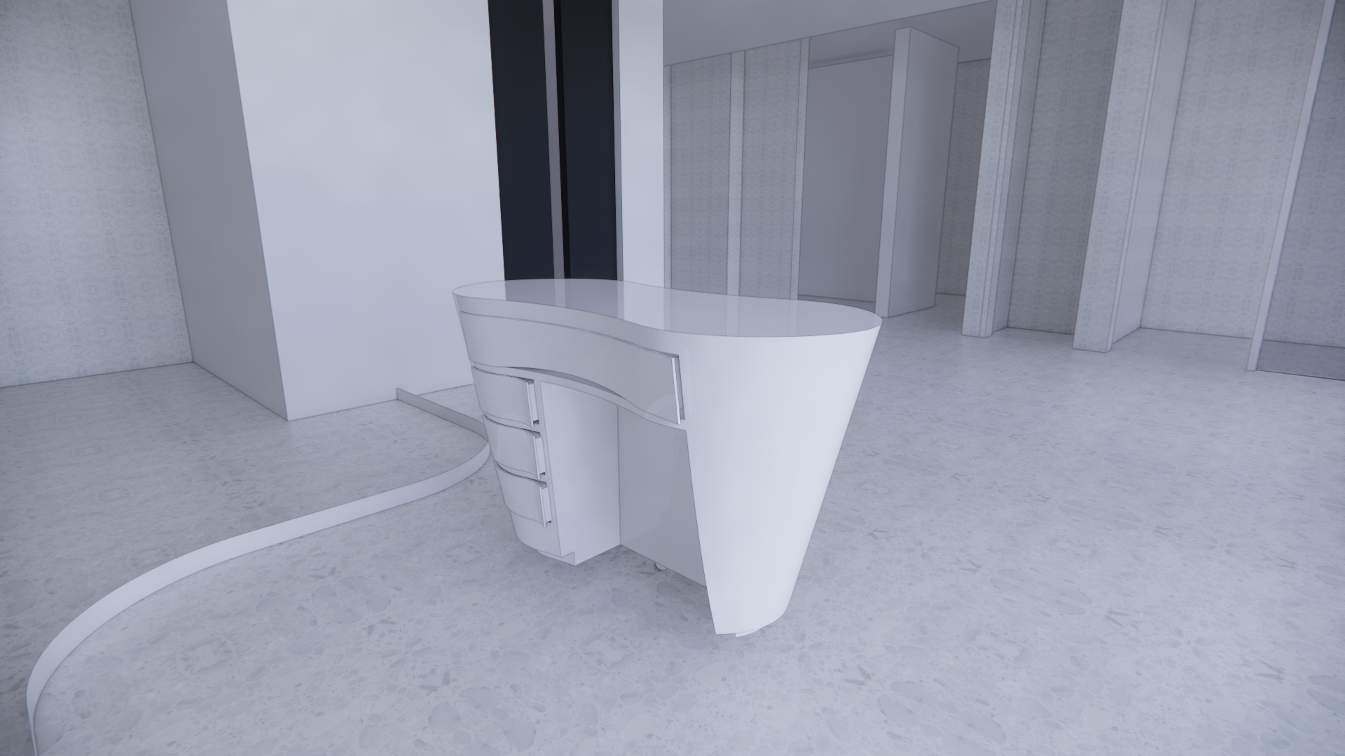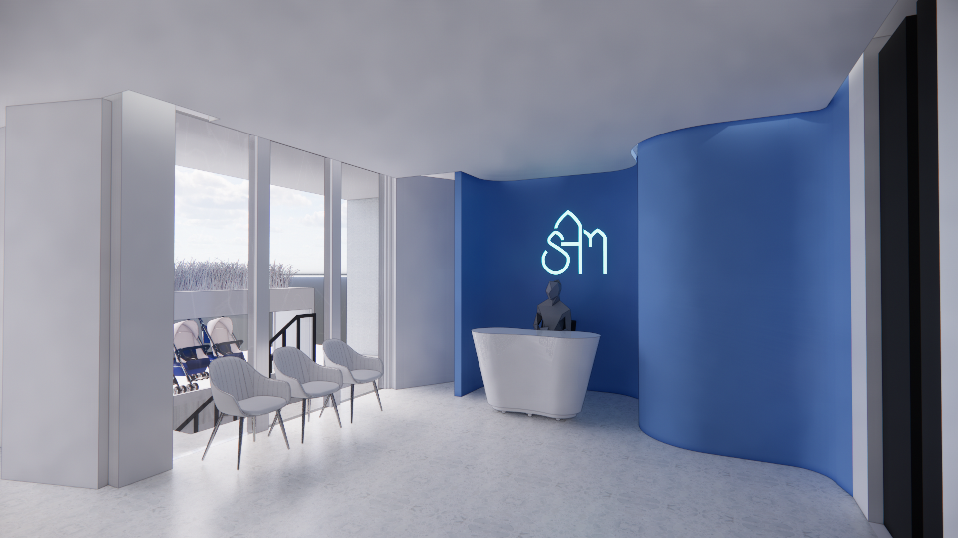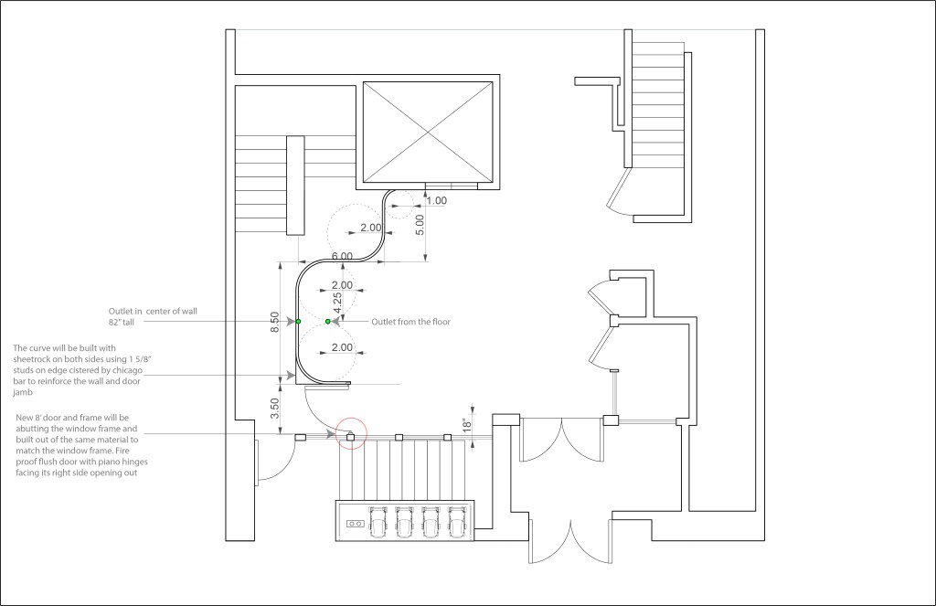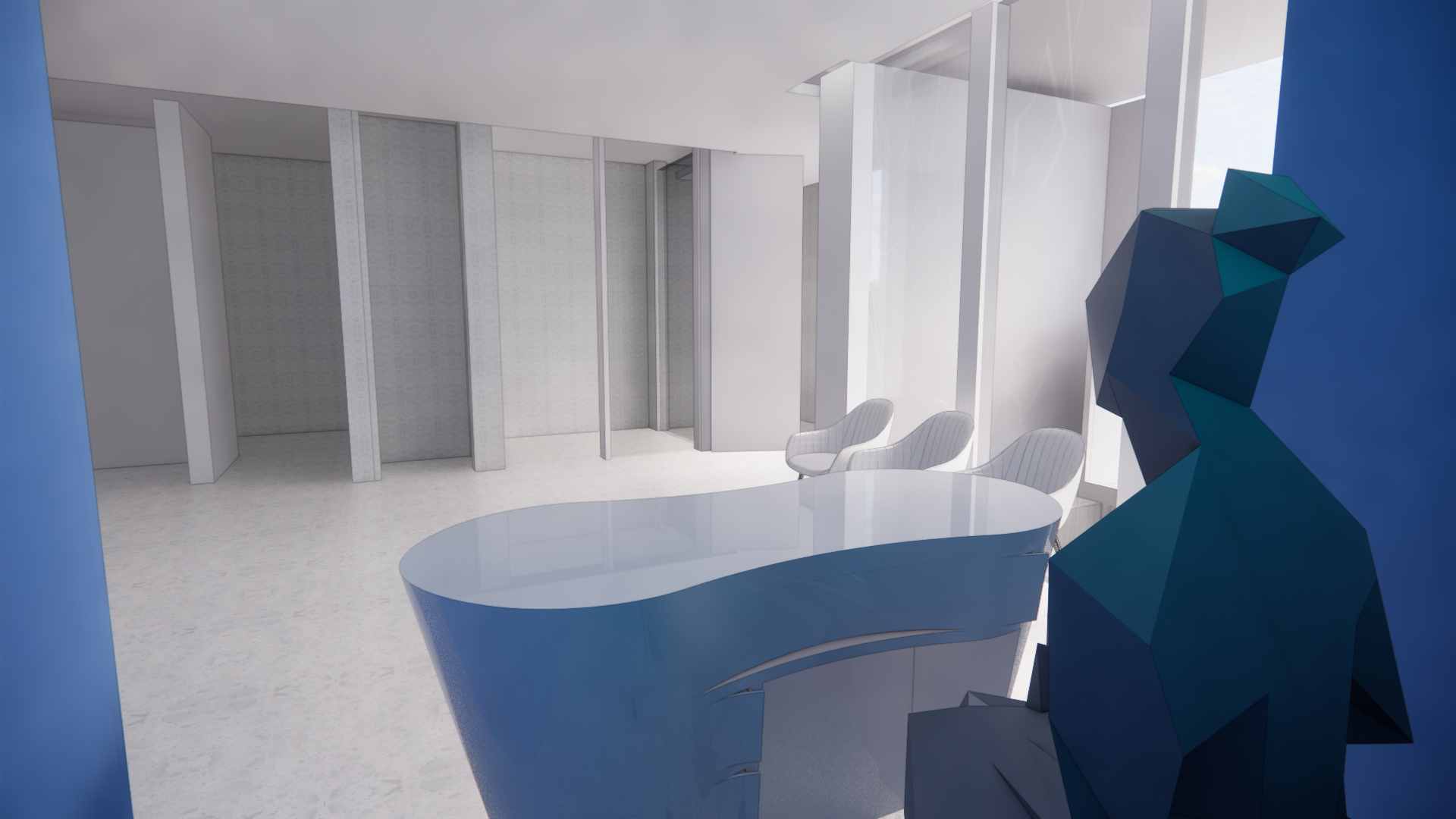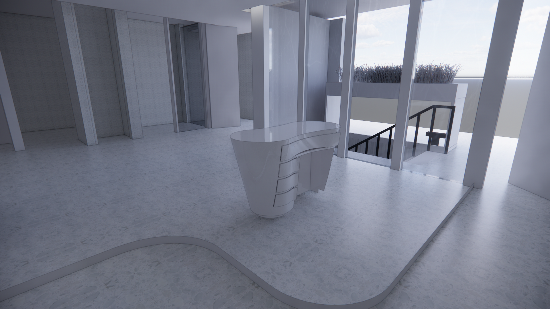Design creates an S wall to allow for an egress door while designating an alcove for a reception desk.