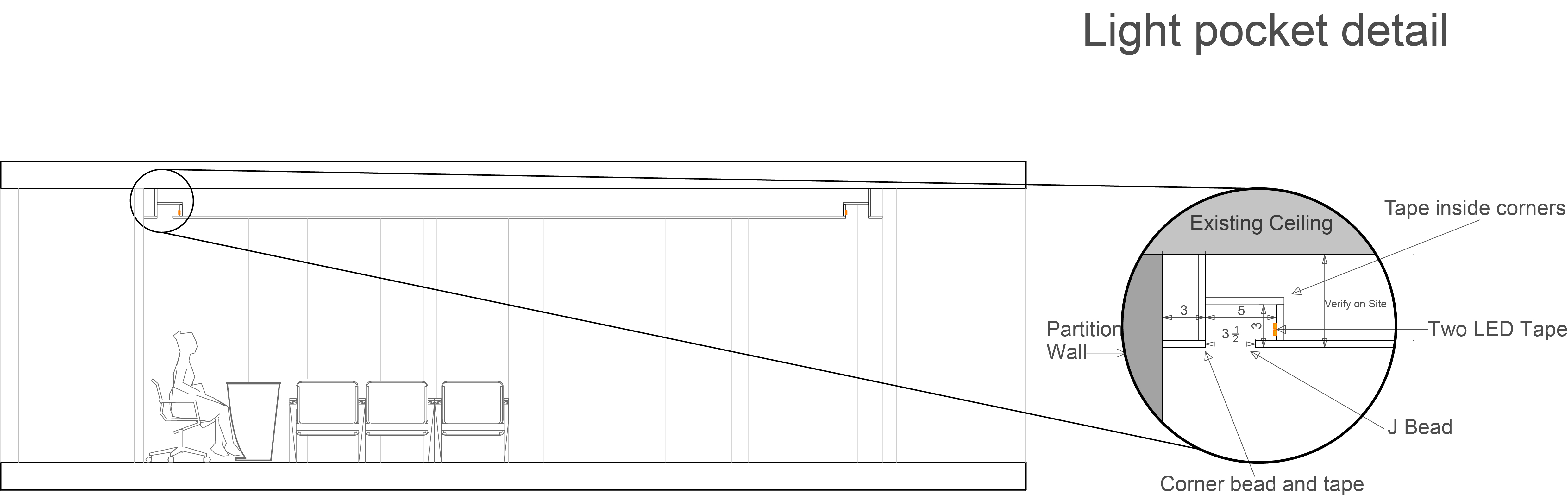 Added design was to include glass panes with a knee wall, and a ceiling light detail along with a RCP